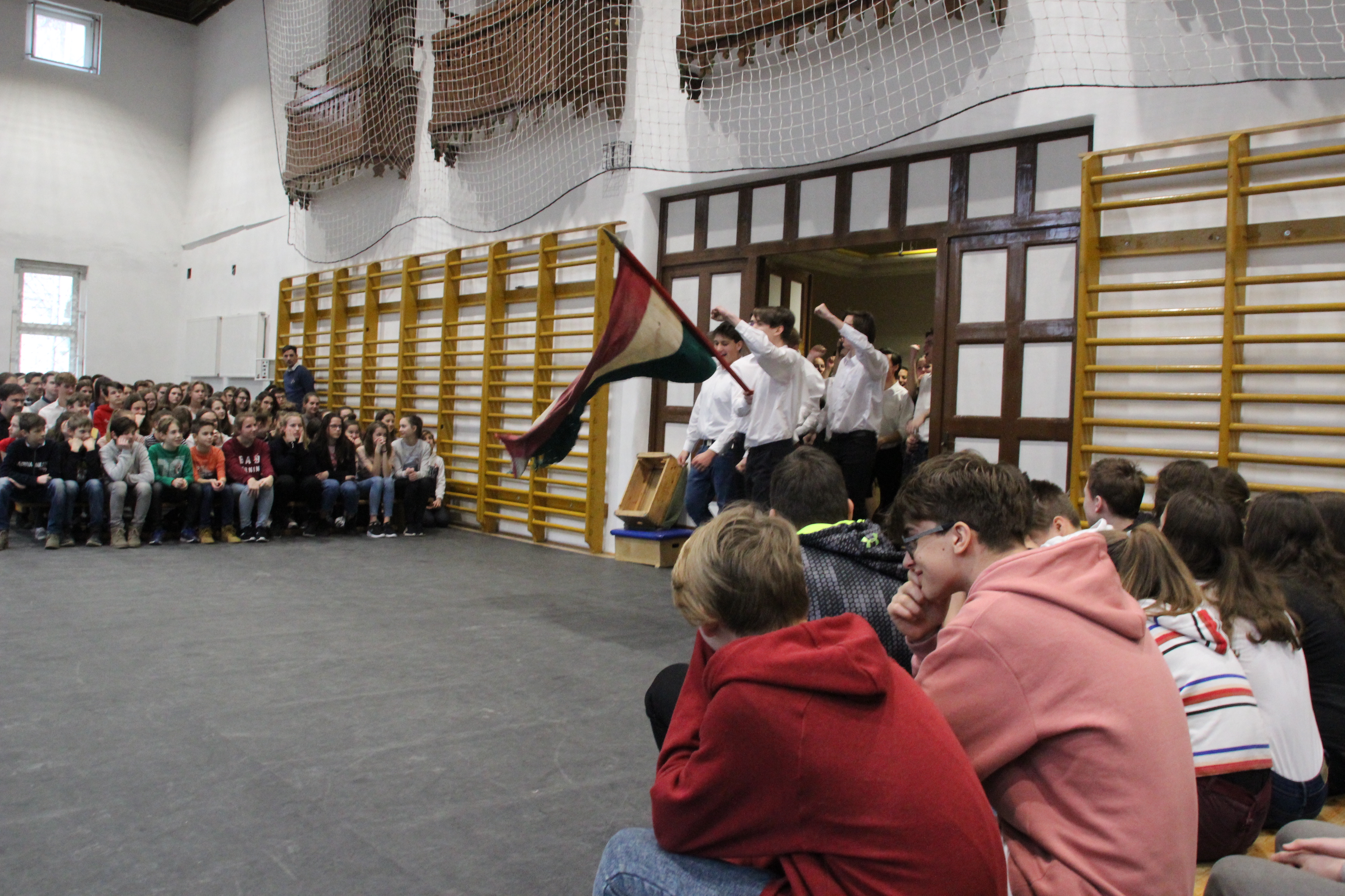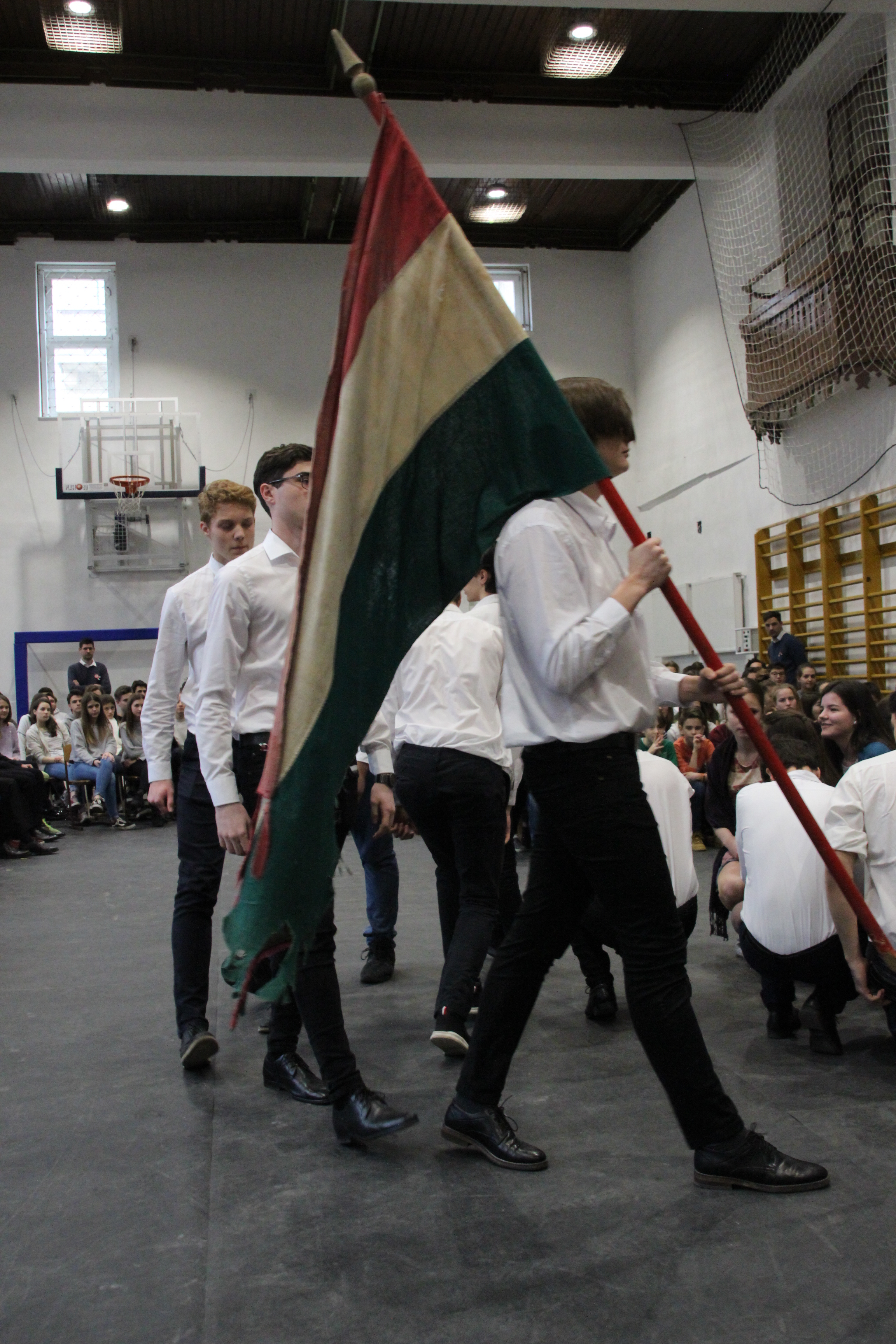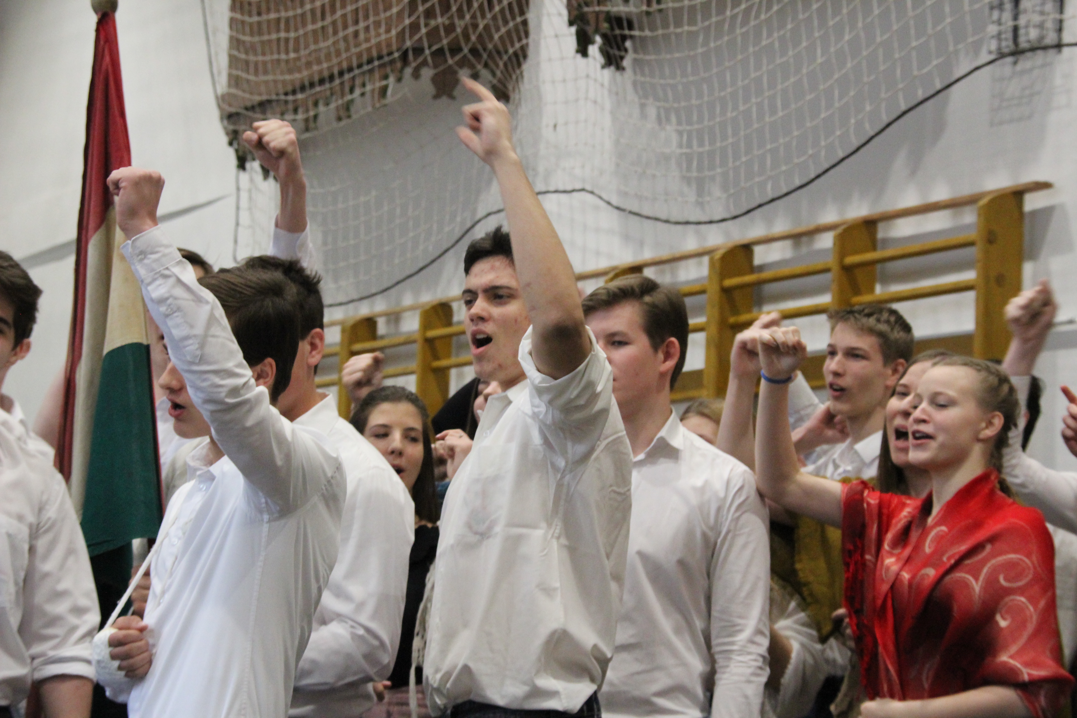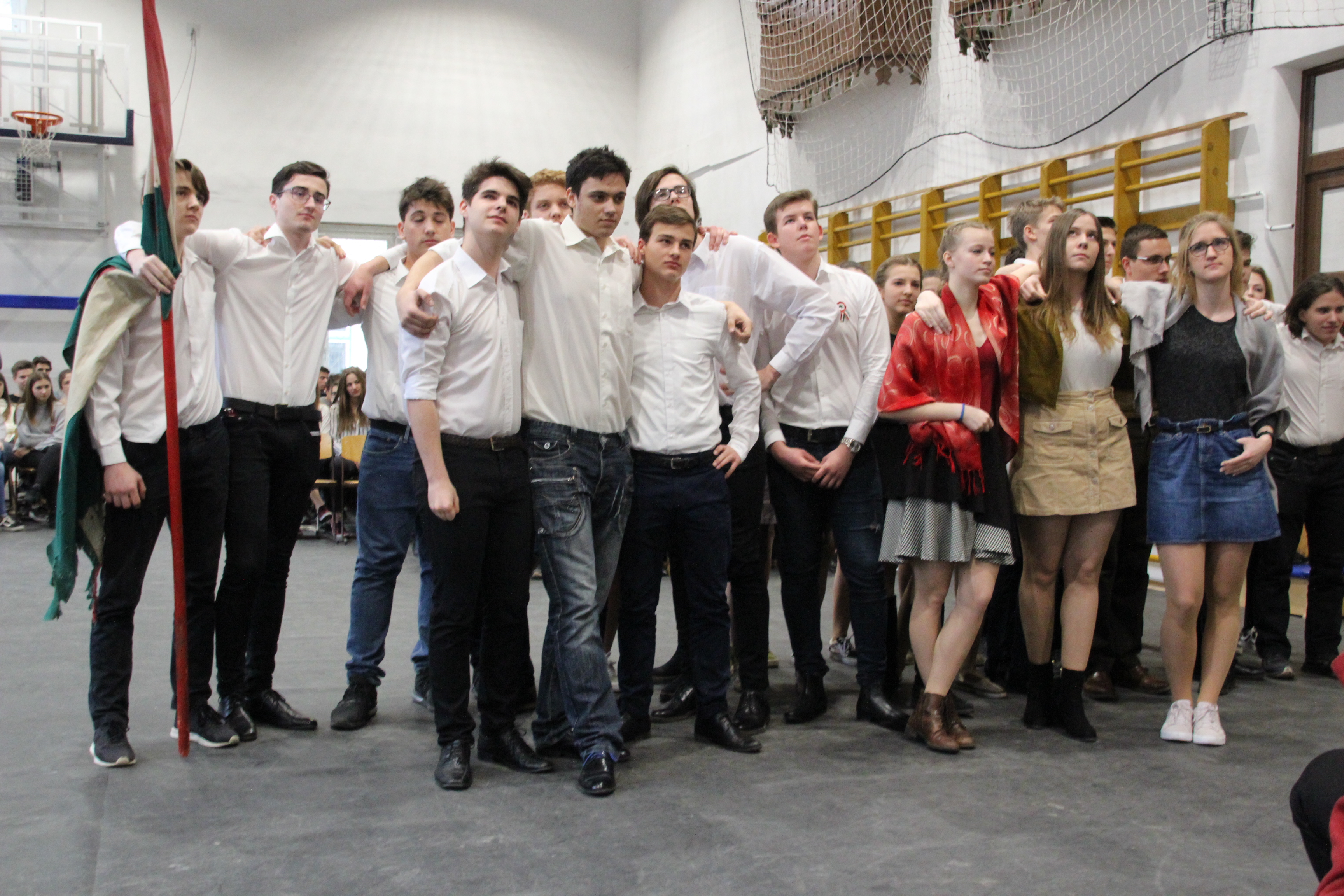 A tornateremben az egész gimnázium megnézte Molnár György tanár úr rendezésében a 11. d osztály frappáns, pörgős, a megszokott elemeket teljesen mellőző, alapvetően az érzékszervekre és érzelmekre ható drámapedagógiai elemekre építő műsorát. Majd osztályonként felkerestünk két-két budapesti emlékhelyet. Ezek egyike a forradalomhoz, a másik a szabadságharchoz kapcsolódott. Az egyik Pesten volt, a másik Budán, és az egyik ismertebb, a másik rejtettebb volt. Így volt akik a Pilvax kávéház (helyét) keresték fel, voltak a Batthyány örökmécset, míg mások Görgei szobrát. De az iskola közelében lévő emlékekhez is eljutottunk: Tóth Ágoston emléktáblájához, Gábor Áron sajátos alakú emlékművéhez, vagy Kovács J. honvéd sírjához.