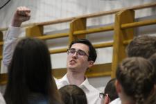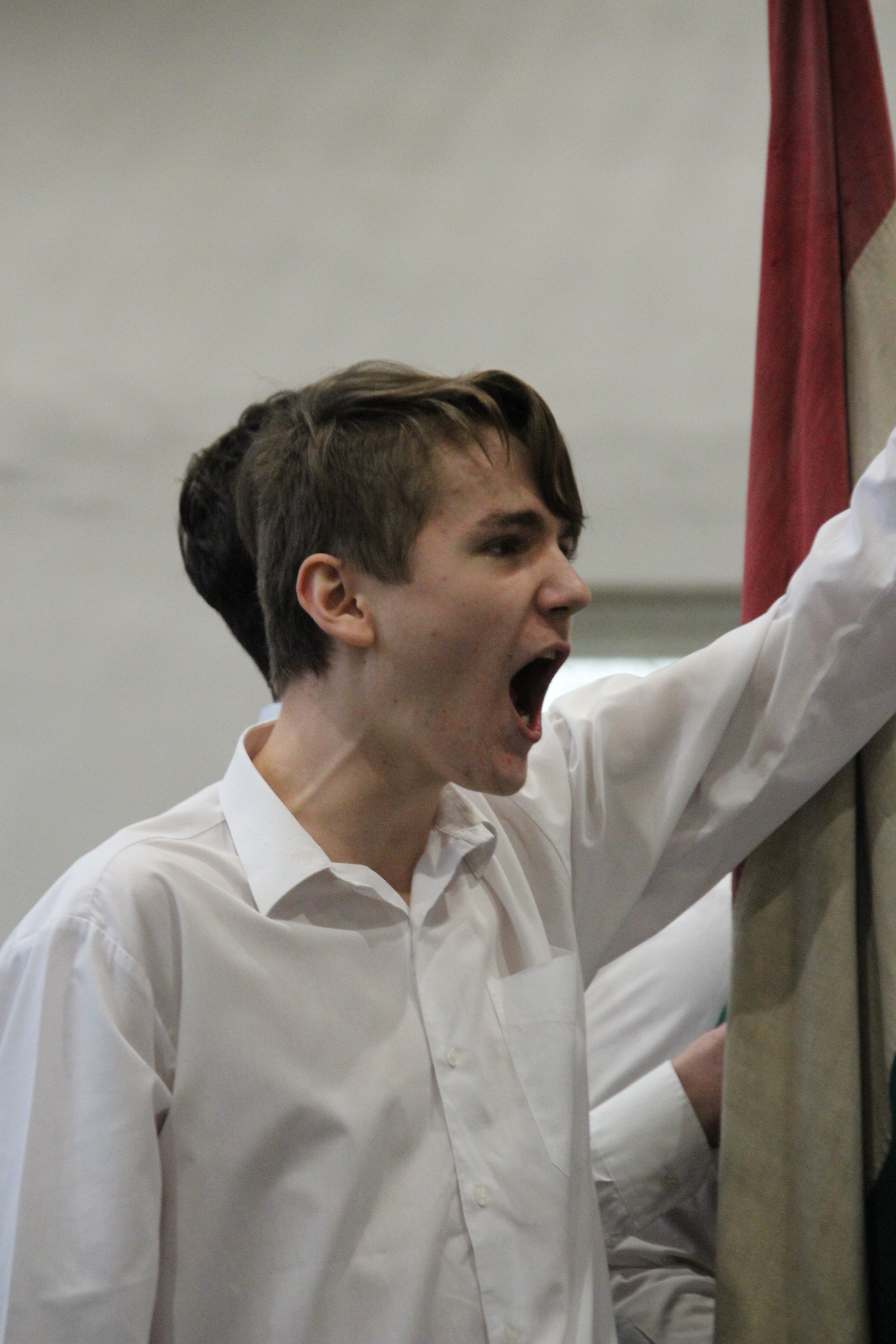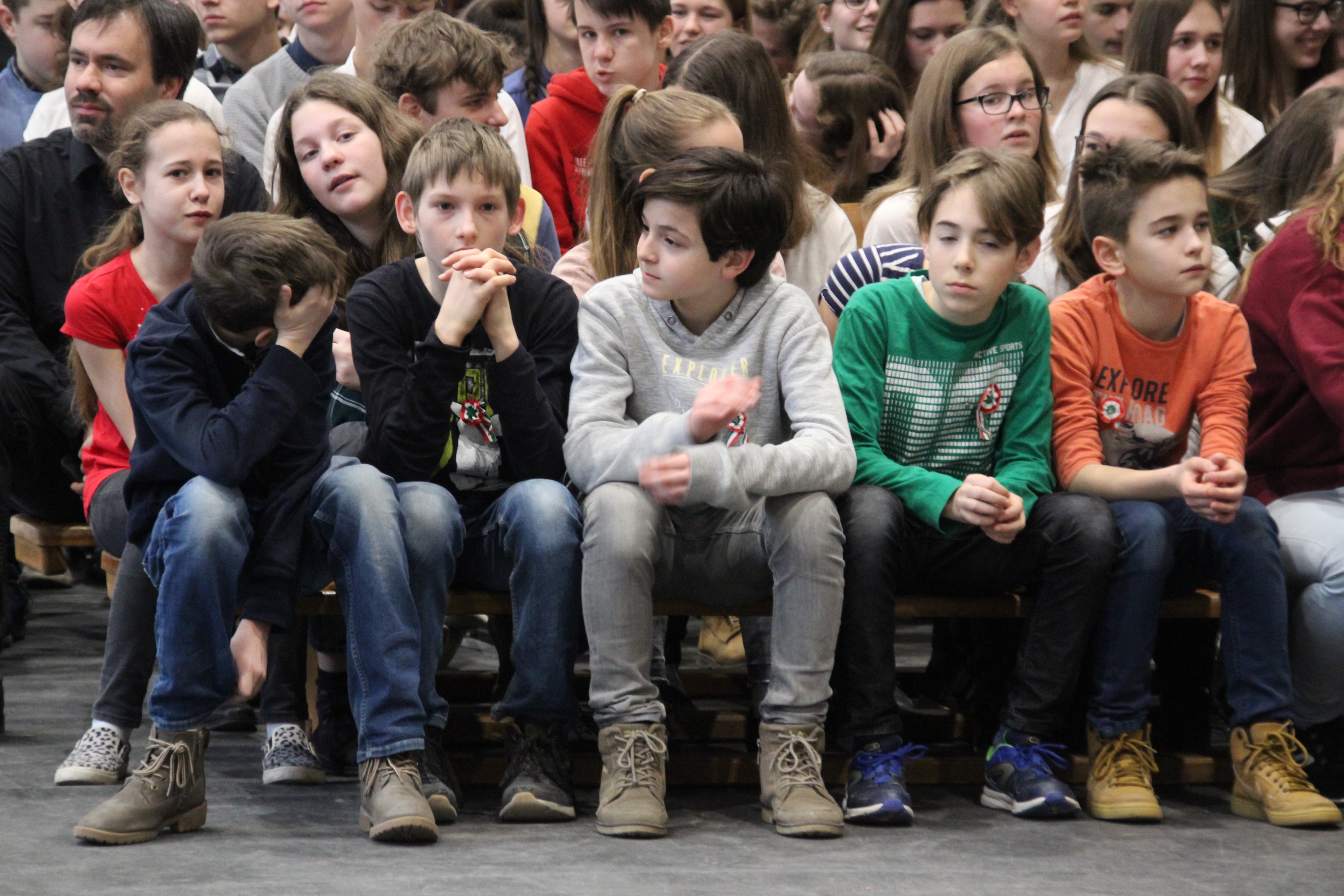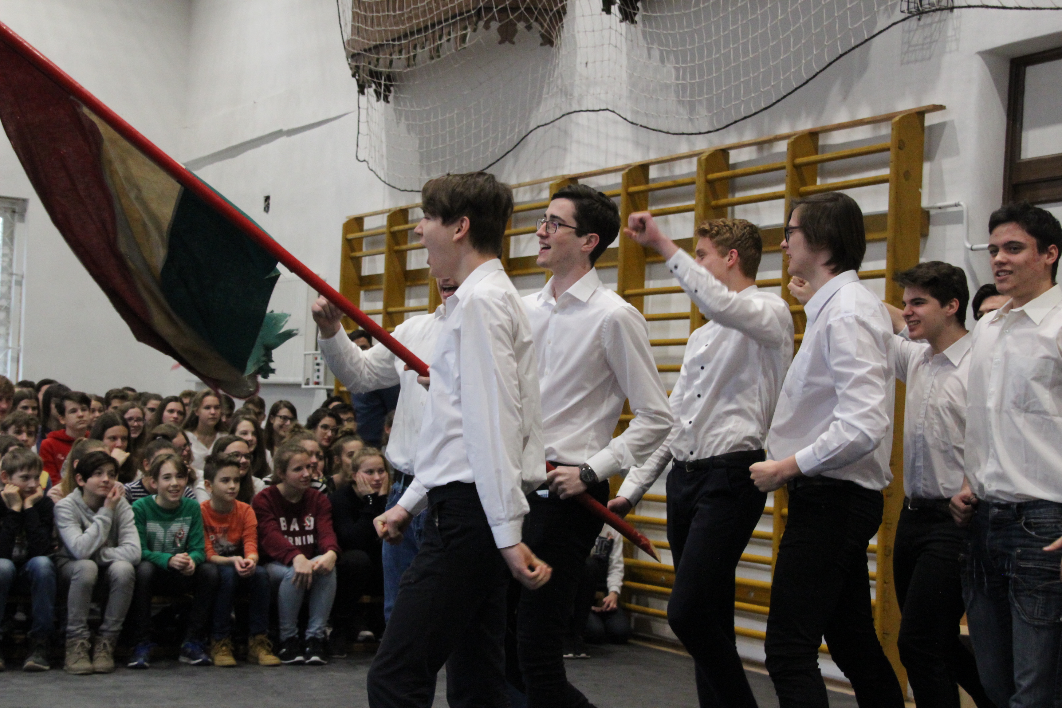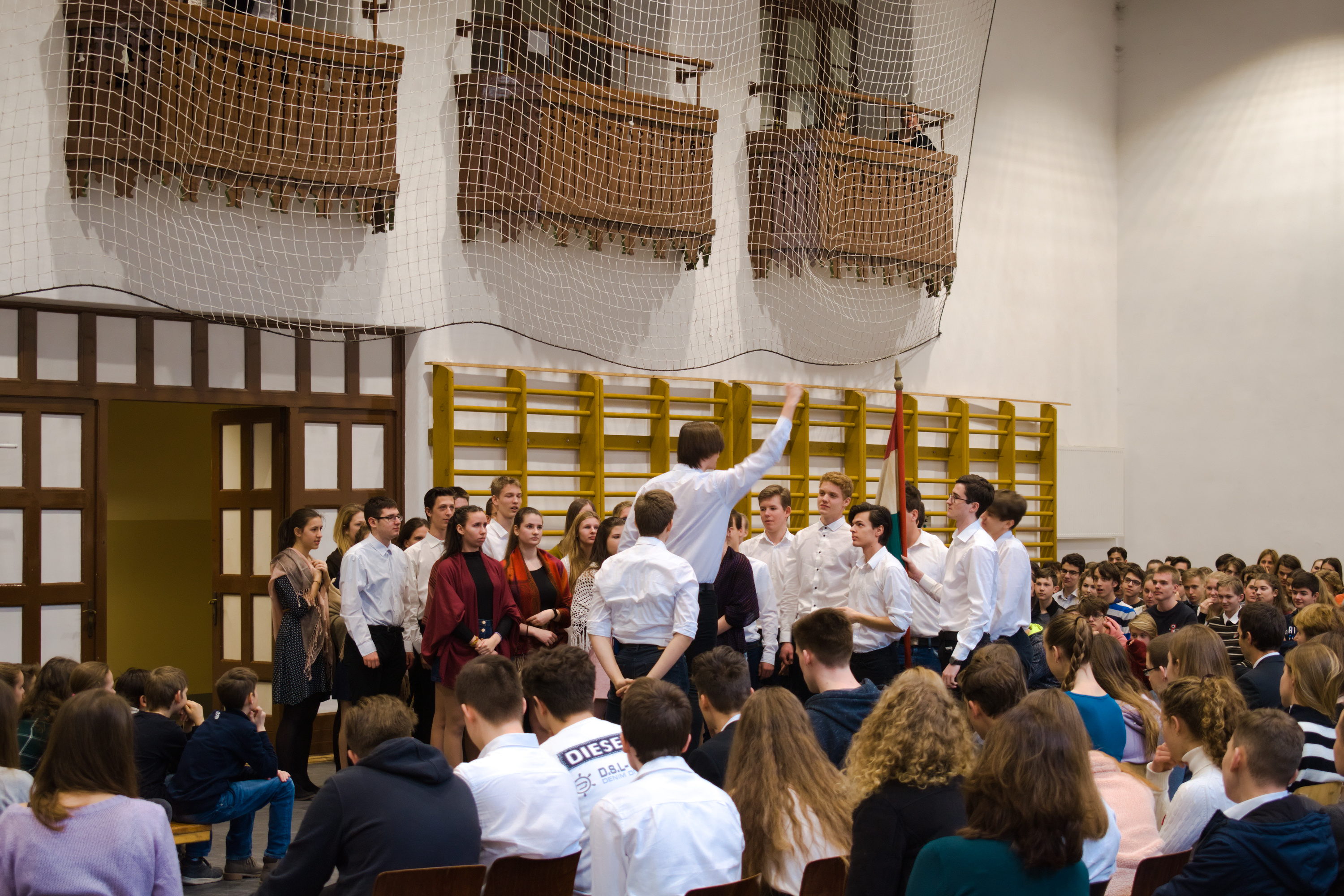 A tornateremben az egész gimnázium megnézte Molnár György tanár úr rendezésében a 11. d osztály frappáns, pörgős, a megszokott elemeket teljesen mellőző, alapvetően az érzékszervekre és érzelmekre ható drámapedagógiai elemekre építő műsorát. Majd osztályonként felkerestünk két-két budapesti emlékhelyet. Ezek egyike a forradalomhoz, a másik a szabadságharchoz kapcsolódott. Az egyik Pesten volt, a másik Budán, és az egyik ismertebb, a másik rejtettebb volt. Így volt akik a Pilvax kávéház (helyét) keresték fel, voltak a Batthyány örökmécset, míg mások Görgei szobrát. De az iskola közelében lévő emlékekhez is eljutottunk: Tóth Ágoston emléktáblájához, Gábor Áron sajátos alakú emlékművéhez, vagy Kovács J. honvéd sírjához.