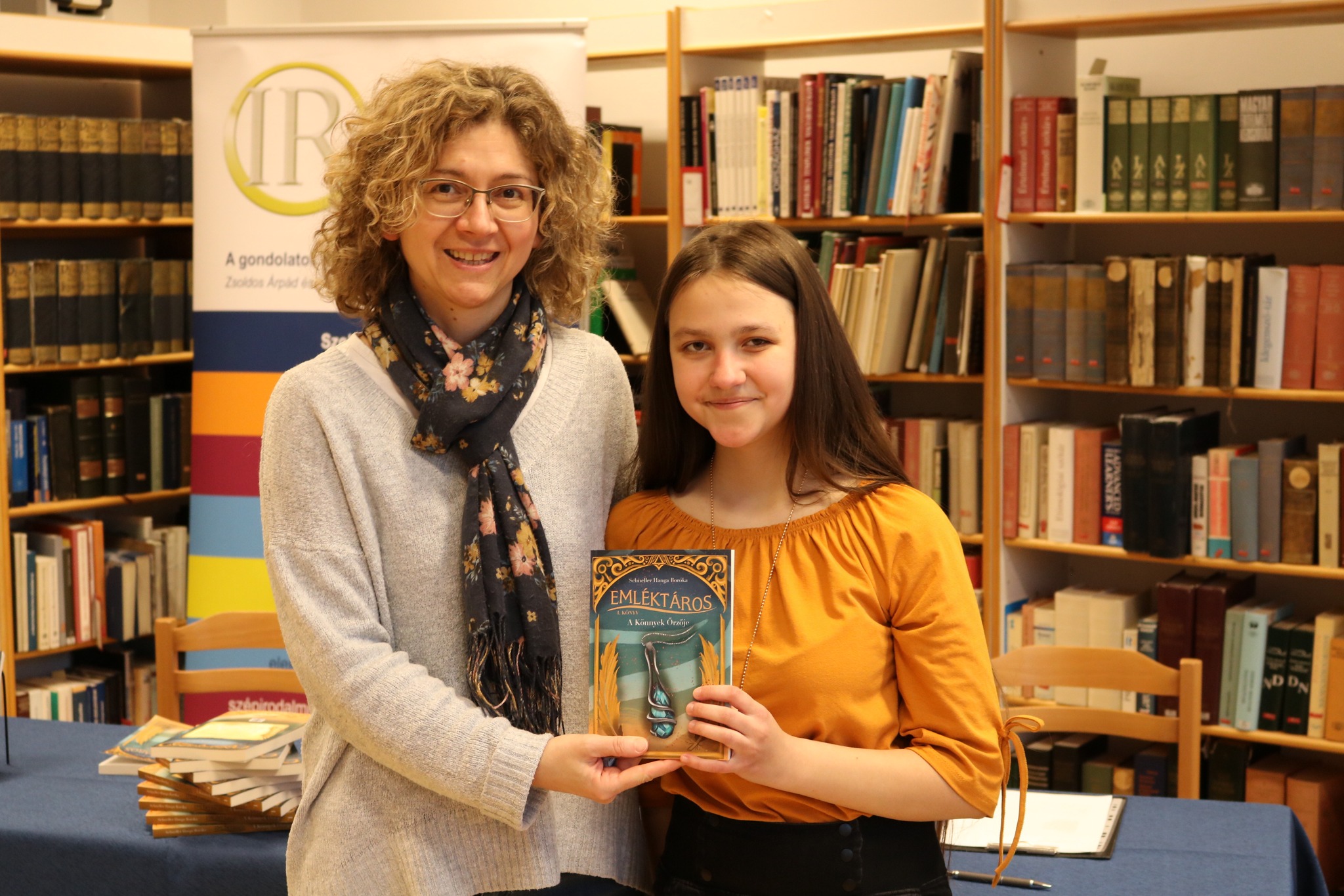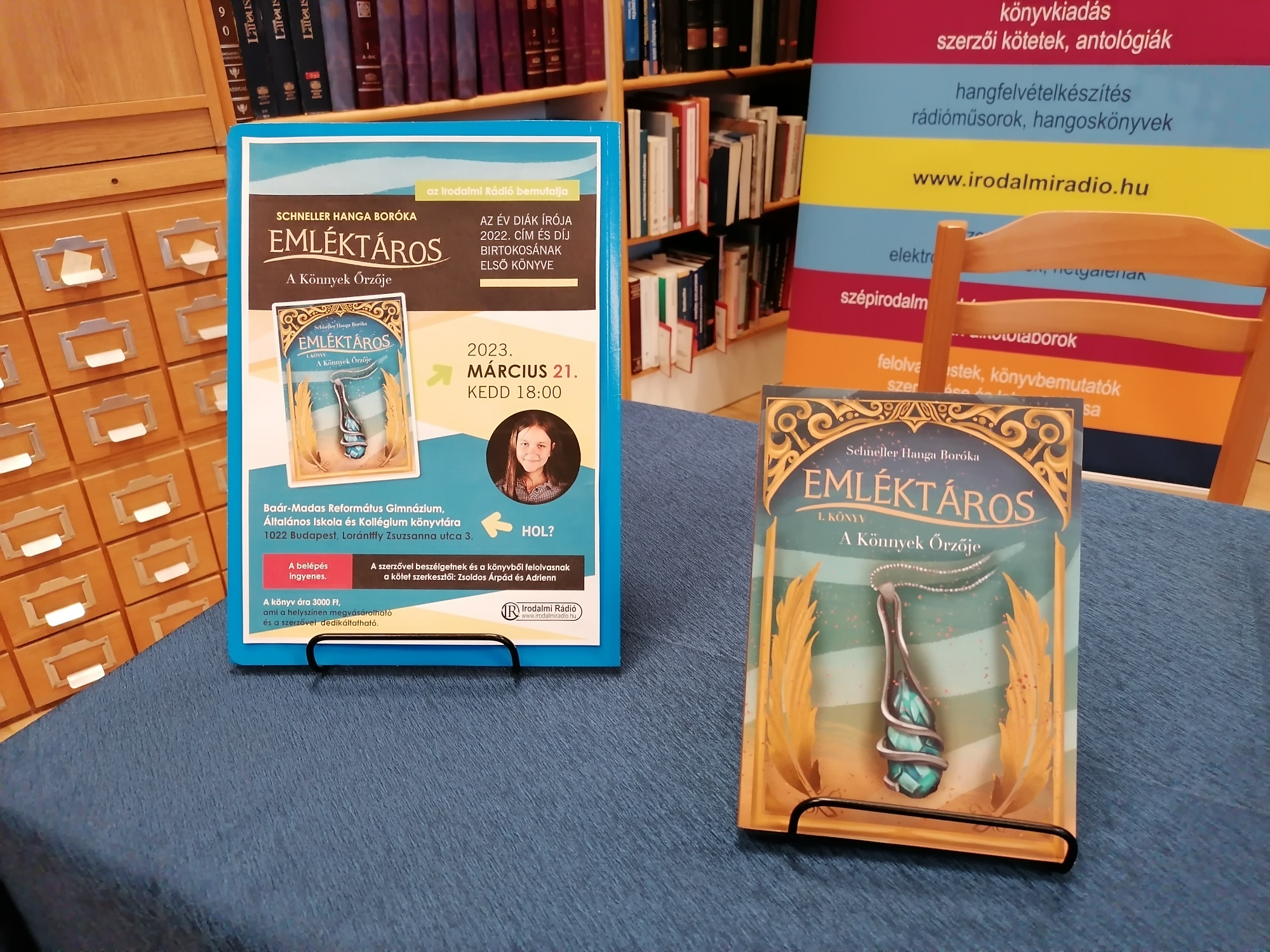 Nagy örömmel és büszkeséggel tudatjuk, hogy ismét egy írónővel gazdagodott a Baár-Madas Református Gimnázium diákjainak köre. Nemes Nagy Ágnes, Szenes Hanna, Bodor Réka Emese és Kubina Zita nyomdokain elindult a 10. c osztályos SCHNELLER HANGÁNK is. Március 21-én kedden este tartotta az Irodalmi Rádió Kiadó Hanga első könyvének a bemutatóját iskolánk könyvtárában. A könyv egy sorozat első kötete, melynek címe: EMLÉKTÁROS – A KÖNNYEK ŐRZŐJE. Igazgató úr köszöntője után, Zsoldos Árpád, a kiadó vezetője beszélgetett Hangával ifjúsági regényéről, majd Zsoldos Adrienn olvasott fel részleteket a műből, mely a Líra könyvesboltokban és a Könyvtárellátó révén megvásárolható. Az ünnepi könyvhéten az Irodalmi Rádió standjánál Hanga dedikálja is majd a regényét, mellyel 2022-ben elnyerte az ÉV DIÁKÍRÓJA címet. Isten áldását kérjük Hanga irodalmi pályafutásához és sok szeretettel gratulálunk neki és szüleinek ehhez a nagyszerű eseményhez. Jó szívvel ajánljuk Hanga könyvét az ifjú olvasóknak! Az osztálytársak közül már többen olvasták a második és harmadik kötet munkapéldányát is, melyeket mi is kíváncsian várunk!