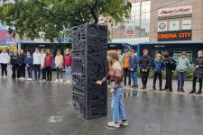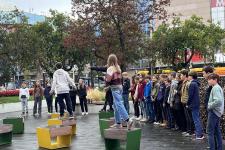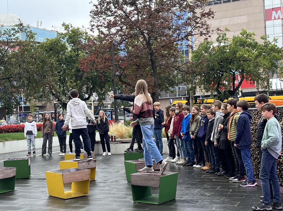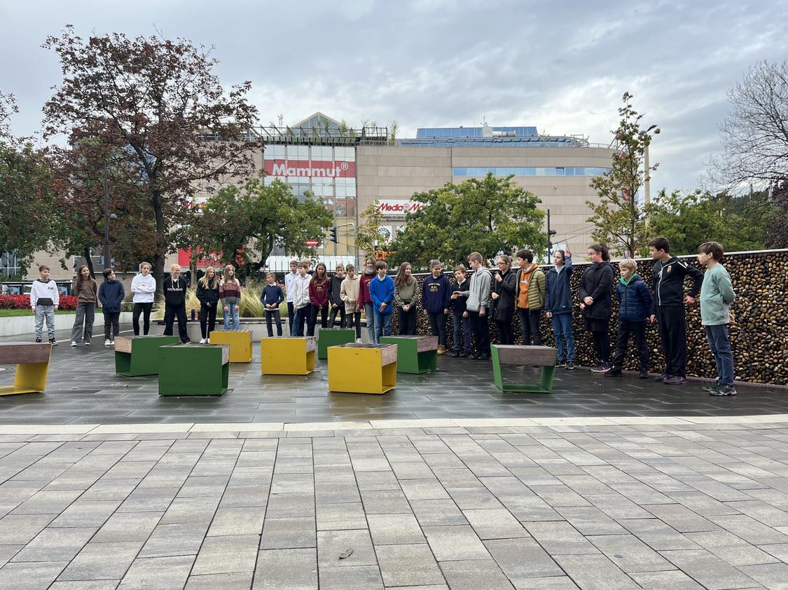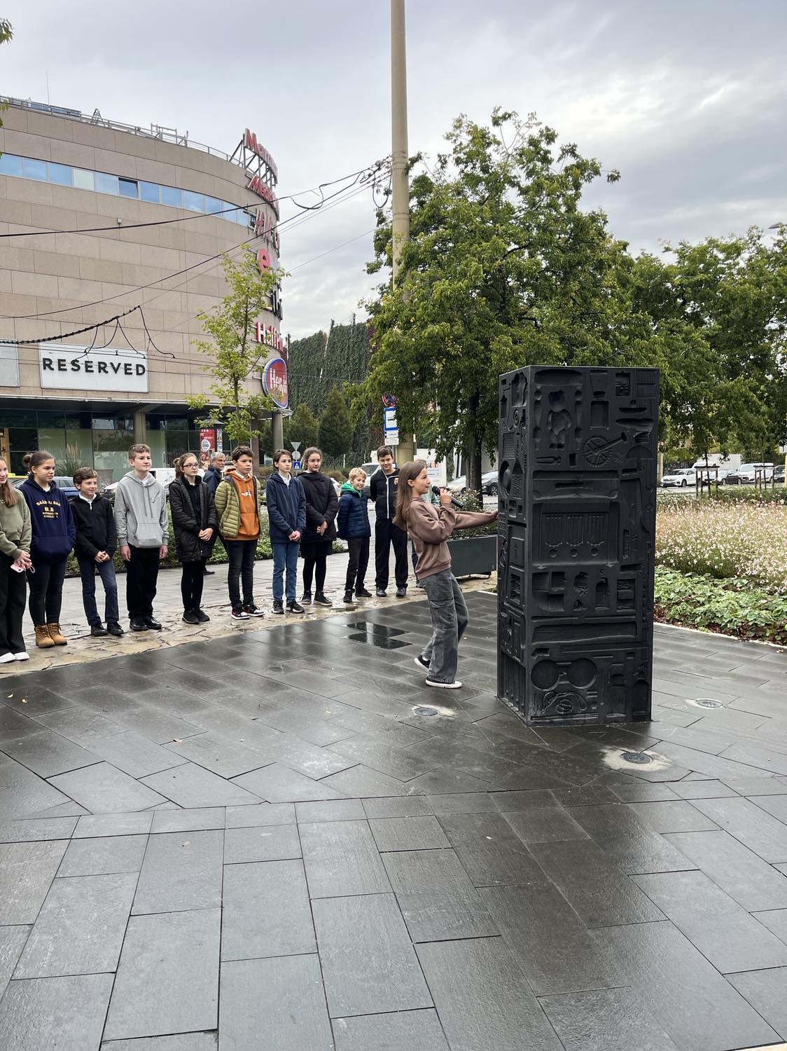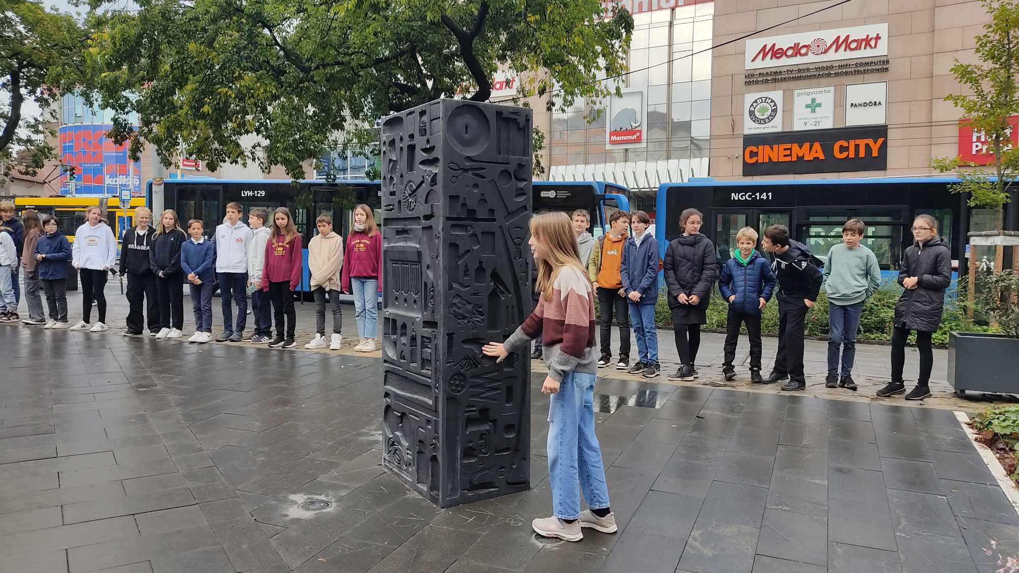 Idén a fentiek miatt választották az általános iskolások a Széna téren található történelmi emlékparkot megemlékezésük helyszínéül. Itt a forradalom eseményeinek változatos megjelenítési formái – úgy, mint a kronoszkópok, a térkövek közt futó Mennyből az angyal Márai vers, a Hatdé Művészcsoport installációja (korhű, egyszerű használati tárgyak lenyomatával) és a nemzeti színekkel megvilágított vízesés – segítették a 6. osztályosok műsorának hiteles átélését, amit még az „Avanti ragazzi di Buda!” dal eléneklésével és annak egy-egy versszakához illő állóképpel is igyekeztünk megtámogatni. A Grynaeus tanár úr által gyermekbarát értelmezésűvé átírt 16 pont is elhangzott, amellyel az osztály a tavalyi márc. 15-i 12 ponthoz képest bizonyította rátermettségét. Így lett Petőfi népéből a Petőfi-kör népe.