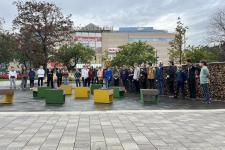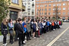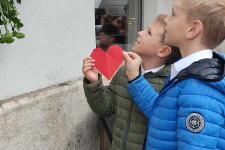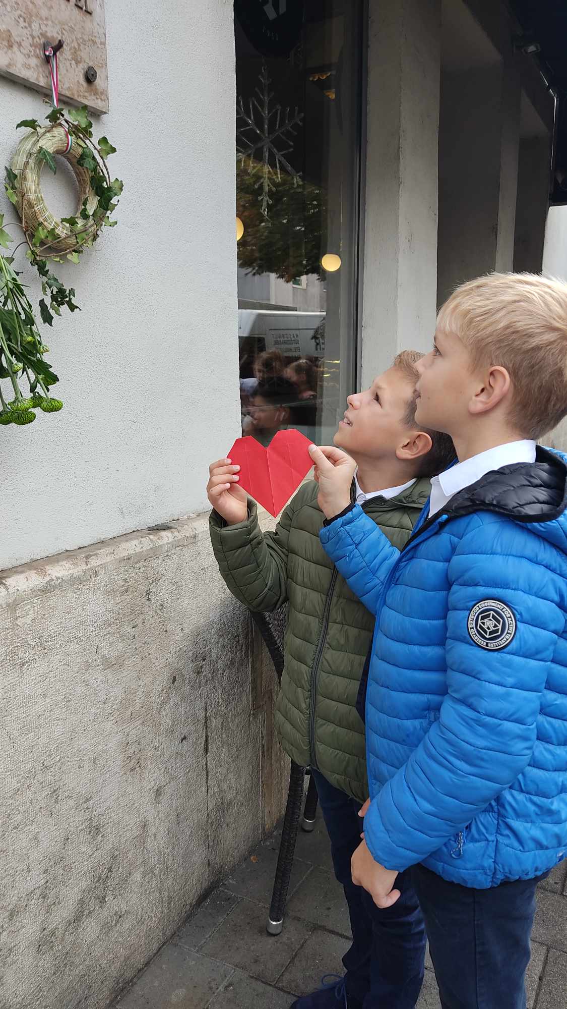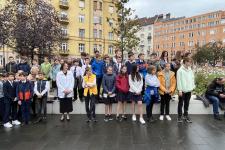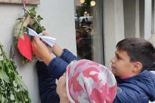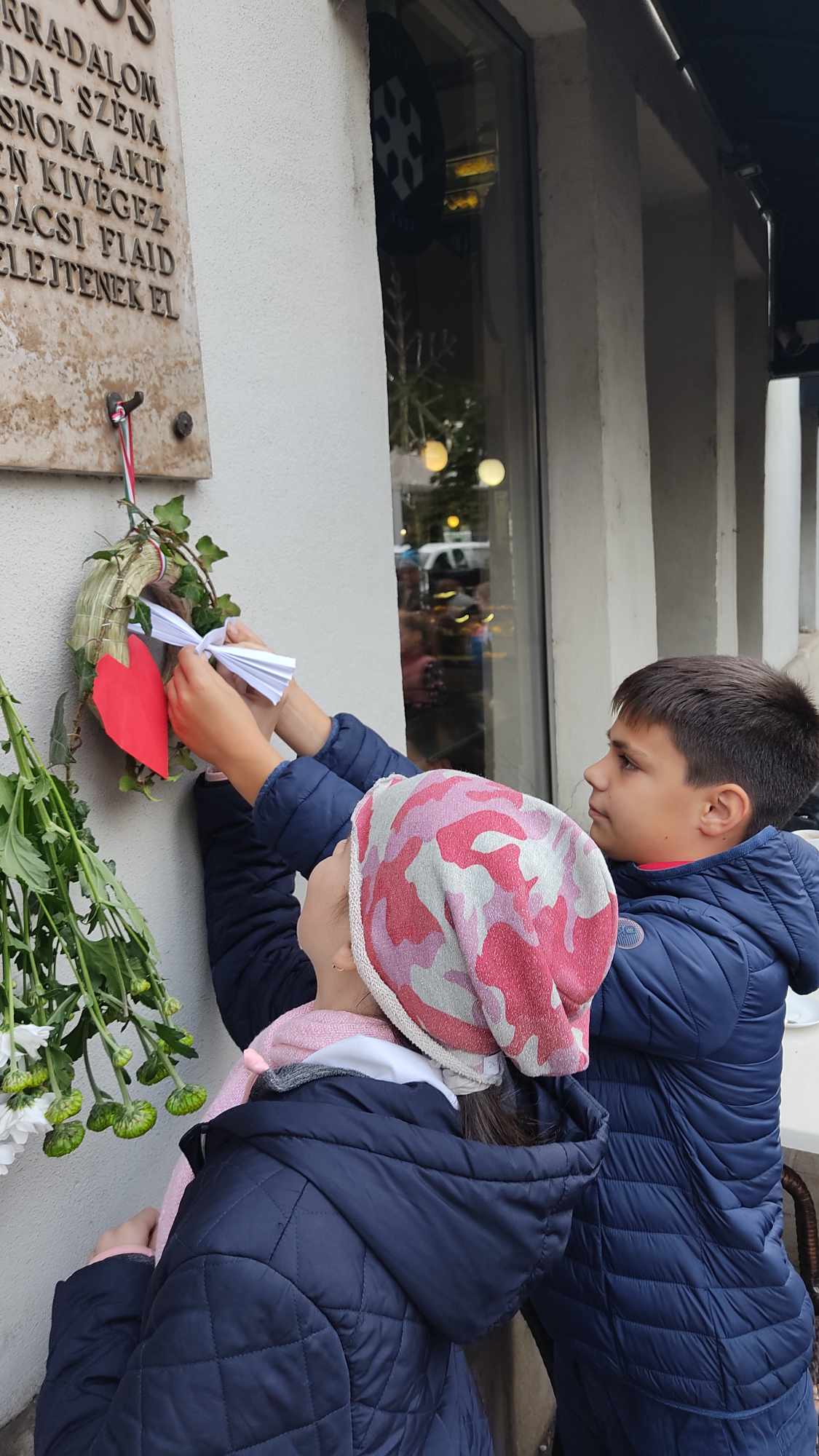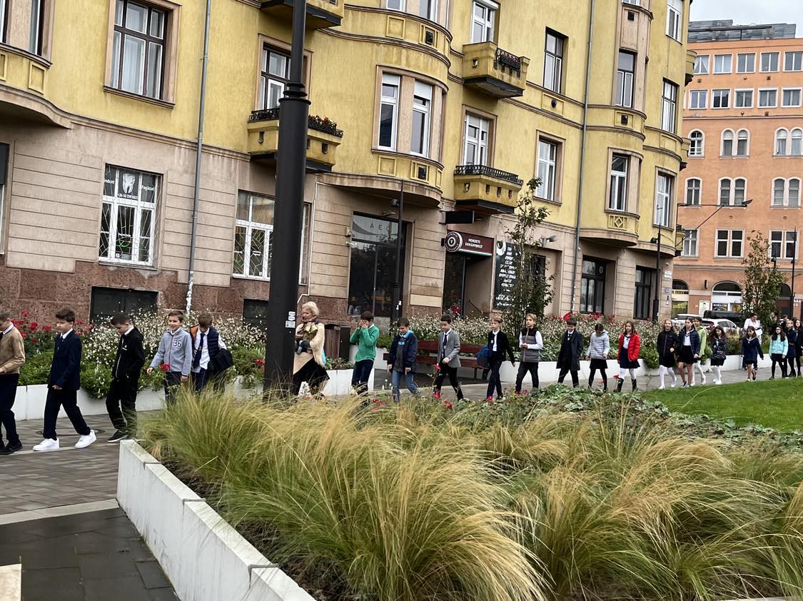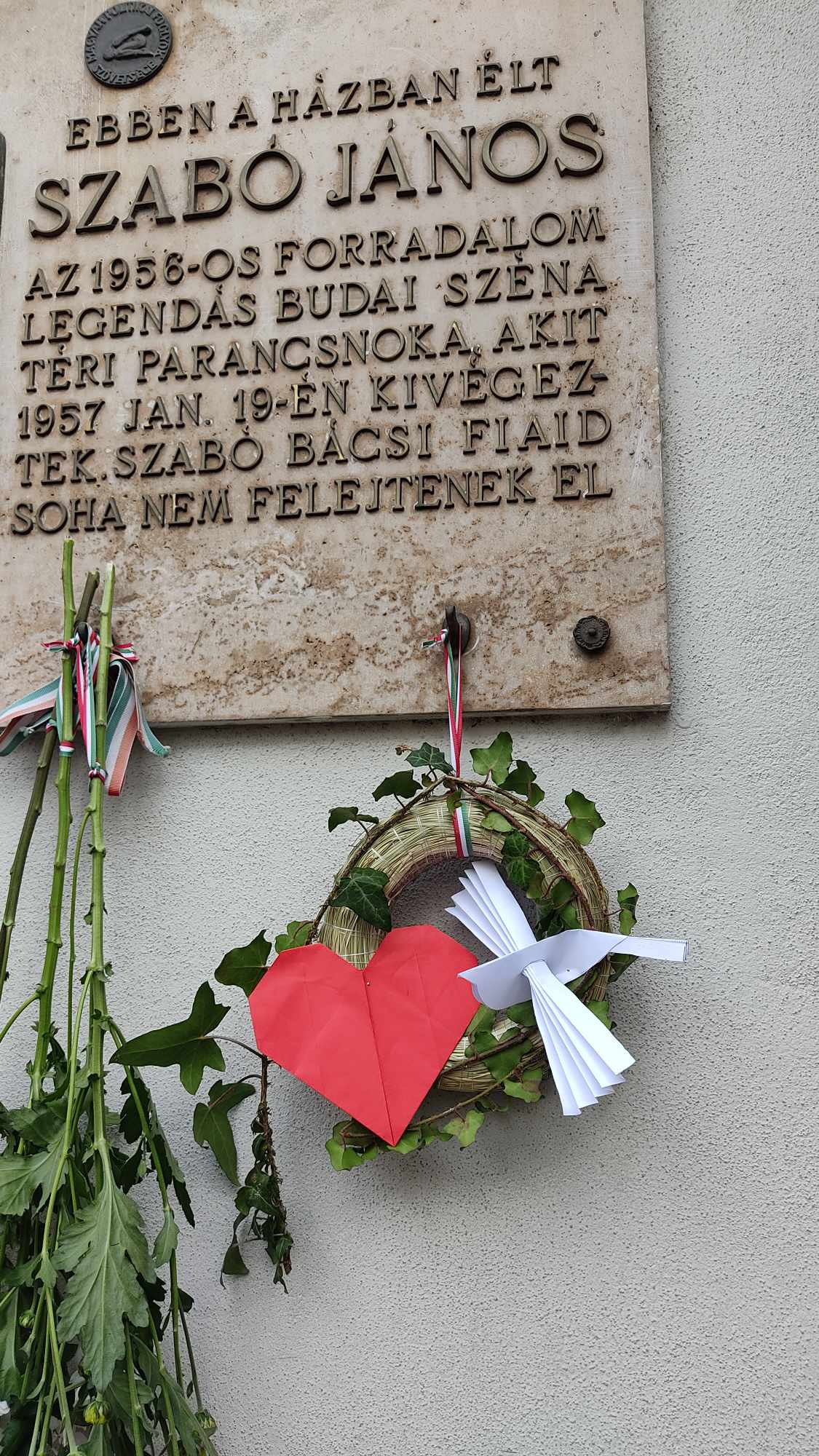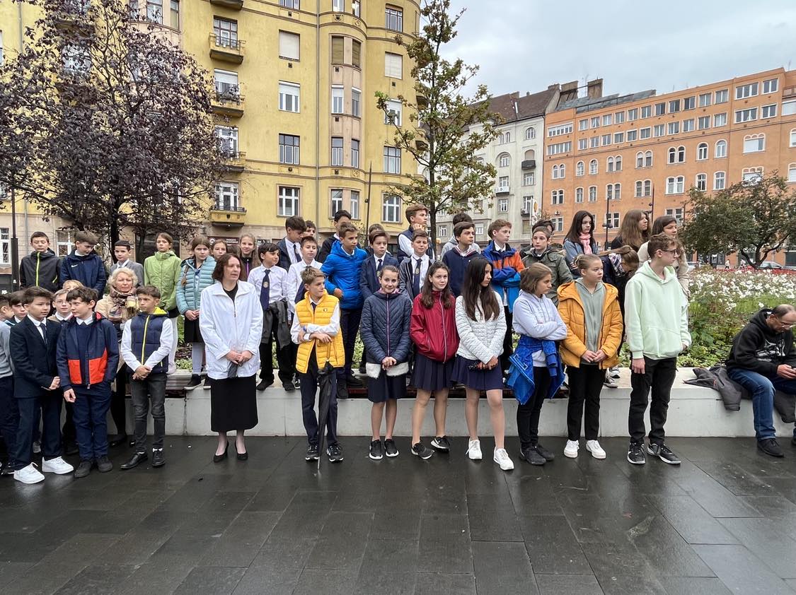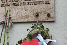 A visszaúton minden osztály lerótta tiszteletét Szabó János emléktáblája előtt (a Fény utca 15. szám alatt): a felsősök egy-egy piros-fehér-zöld virággal, míg a legfiatalabbak koszorúalapjára a másodikosok helyezték fel a borostyán díszítést, a harmadikosok a piros szívet, a negyedikesek pedig a fehér madarat, a hatodikosok a szövegezett nemzetiszín szalaggal kötötték át az emlékezés szimbólumait.