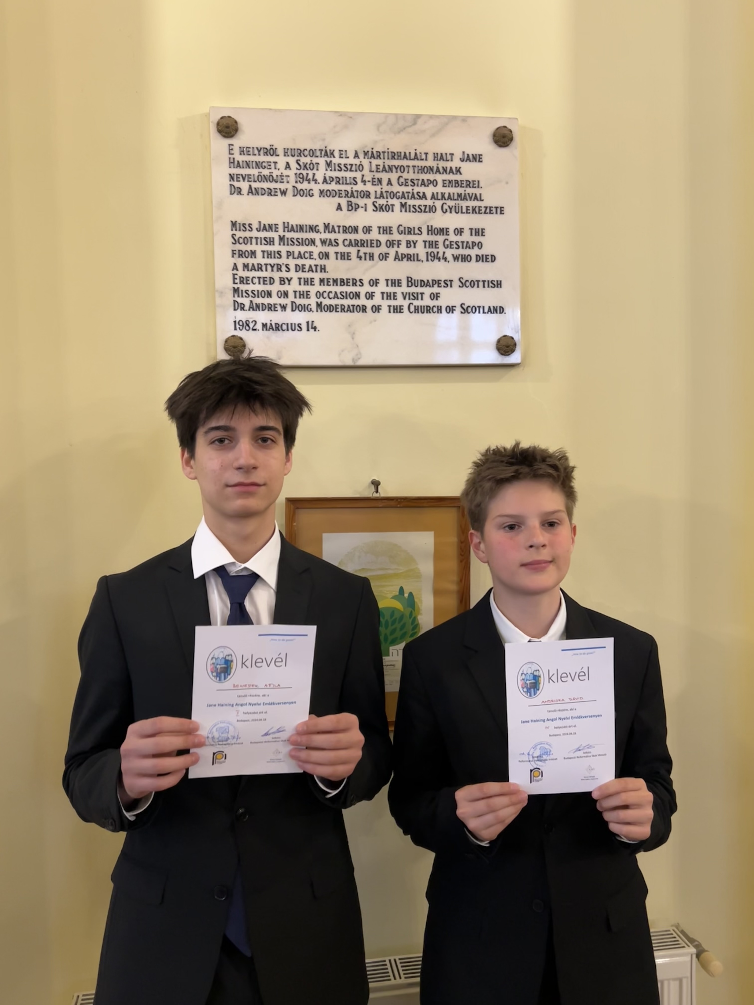 Április 18-án rendezték meg a Jane Haining Angol Nyelvi Emlékverseny döntőjét a budapesti Skót Misszió kápolnájában. A szóbeli fordulóra nem véletlenül került sor a holokauszt emléknapjának hetében. Ez az alkalom nem csak az angolul jól beszélő diákok tudásának megmérettetéséről szólt, hanem visszaemlékezés és egyben tisztelgés volt a pontosan 80 évvel ezelőtt hazánkból elhurcolt skót tanítónő önfeláldozó, példamutató élete előtt.