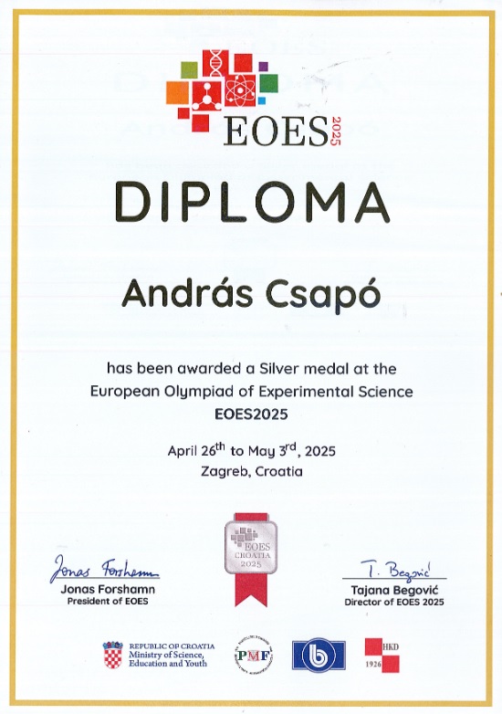 Az EOES (European Olympiad of Experimental Science) évente ismétlődő természettudományi olimpia az Európai Unióban élő fiatalok számára. Idén Horvátország fővárosában, Zágrábban rendezték meg a versenyt. A megmérettetésen 24 ország képviseletében két-két, háromtagú csapat mérte össze tudását. A csapatoknak két feladatot kellett végrehajtaniuk, biológia, kémia és fizika tantárgyak készségeire alapozva.