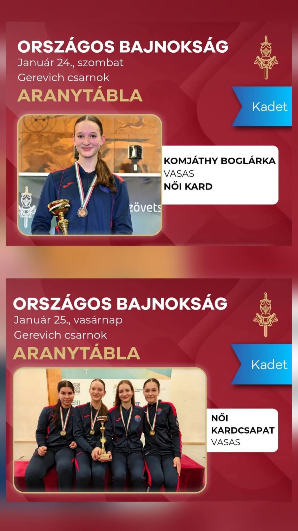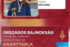 A január 24-25-ei hétvégén rendezték a kadet kard országos bajnokságot, ahol kiválóan szerepeltek iskolánk tanulói. A szombati egyéni versenyen Komjáthy Boglárka (10.b) aranyérmes lett, vasárnap pedig a Vasas megszerezte a csapatbajnoki címet, Boglárka mellett Kruchina Lilla és Petrovszki Anna Zsófia 10.b osztályos tanulókkal a soraiban. Ugyanezen a bajnokságon Kézdi-Kovács Boldizsár (9.d) is aranyérmet szerzett a TFSE csapatával!Nagy az öröm és a fáradtság mindenütt.
