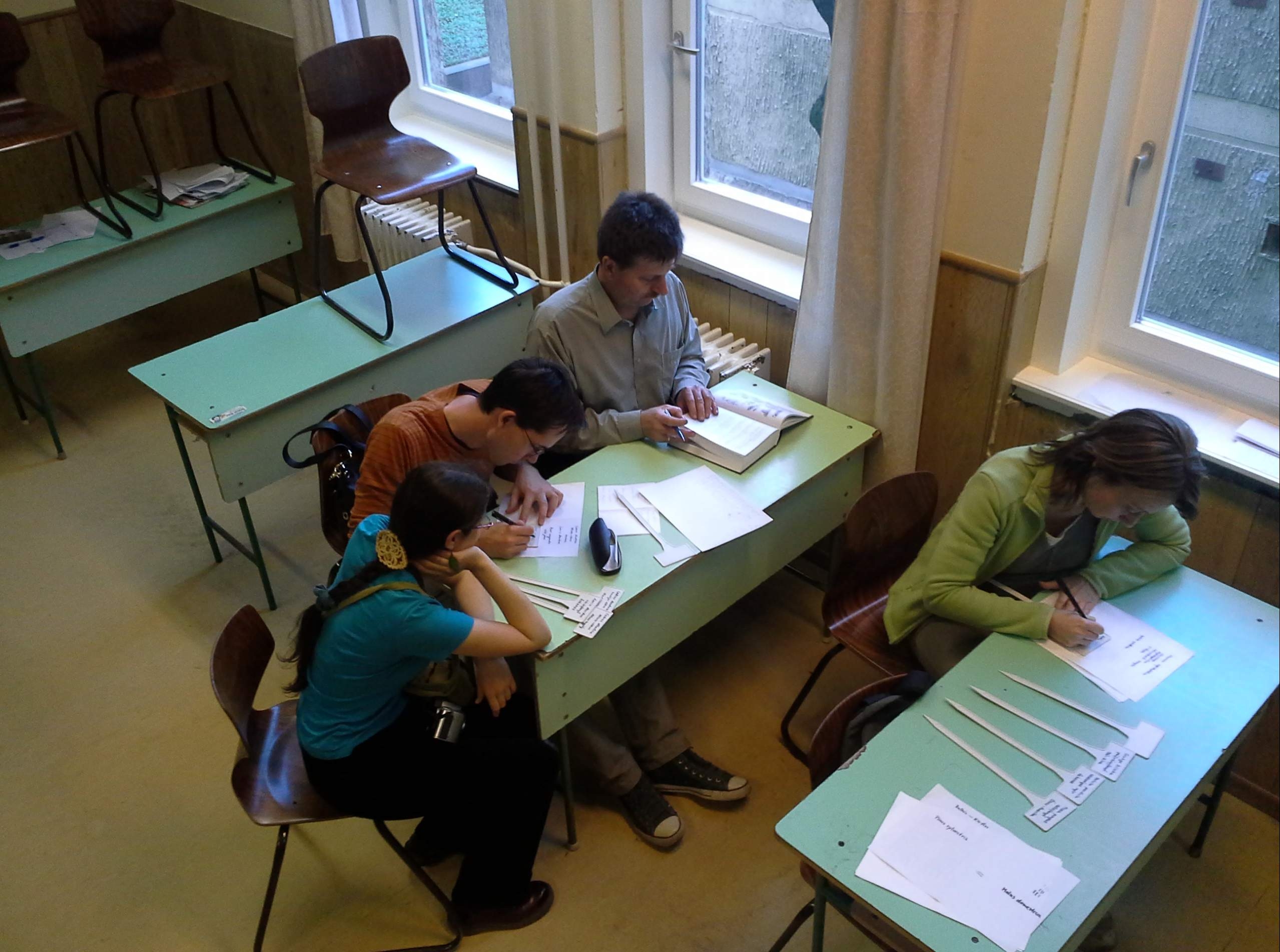 Az Iskola biztosította az új névtáblákat, a Botanikai Szakosztály önkéntesei: Csontos Péter, Höhn Mária, Kalapos Tibor, Kovács Gábor, Lovranics Júlia és Papp Mónika pedig a szükséges szaktudást adták; feliratozták és kihelyezték a névtáblákat az Iskola Kertjébe. A munka kivitelezésére két, nyáriasnak mondható tavaszi napon, április 16-án és május 5-én került sor, amikor összesen 51 jeltábla került elhelyezésre. Ezek 13 nyitvatermő, 36 zárvatermő fásszárú és 2 zárvatermő lágyszárú faj megismerését segítik az Iskola diákjai számára. A táblákon szerepel a megjelölt növény magyar és latin neve, valamint az a földrajzi régió, ahonnan származik, illetve ha az adott faj hazánkban természetes módon is előfordul akkor az "őshonos" megjelölés. A kitáblázott fajok magyar, illetve auctor névvel ellátott latin neveinek listája a függelékben olvasható. Először összeírtuk a kertben található jellegzetes fákat és cserjéket, aminek során egymástól is sokat tanultunk. Ezután az Iskola egyik tantermében elkészítettük az új táblák feliratait és felújítottuk az évek során lekopott régi táblák írásait. A névtáblák kihelyezésének munkáiból mindenki kivette részét.