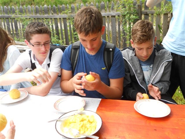 Reggel amikor felébredtünk gyönyörű kilátás tárult elénk. A dús fű körülölelte a fákat és olyan sűrű volt, hogy egy tenyérnyi föld sem látszott körülötte. Délelőtt meglátogattuk a „bundást”. Itt láttuk hogyan készül egy bunda, picit dolgozhattunk mi is. Később találkoztunk az ottani hetedik osztályosokkal. Együtt táncoltunk, nekünk ez jobban ment. Megismerhettük Erdély legszebb lányát, Anettet. Népviseletben volt és tudott táncolni! Még ezen a napon betértünk egy kovács műhelyébe, a kovács is kedves ember volt. Ott láttam először lópatkolást. Az eső úgy esett, mintha dézsából öntötték volna, szerintem ott futottuk addigi legjobb időnket a műhelytől szállásunkig.