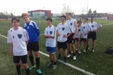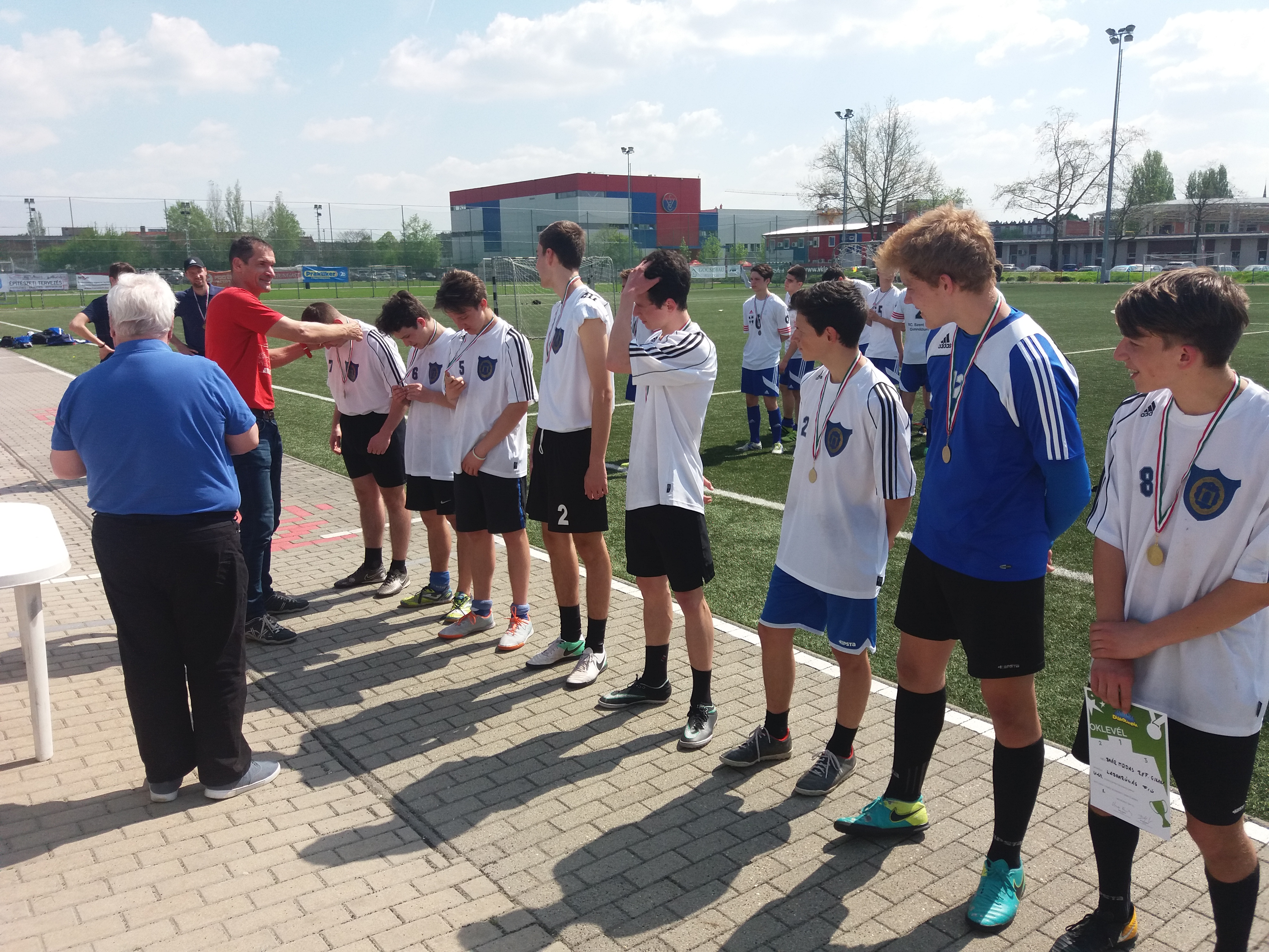 Nagy reményekkel, szép, szinte nyárias időben érkeztünk meg szerdán reggel a Vasas pályára. Mivel hármas csoportba kerültünk és az előzetes sorsolás nekünk kedvezett, ezért megnézhettük, hogy a másik két csapat miként küzd meg egymással. Az eredmény talán kedvező is lehetett volna számunkra, mivel döntetlenül végződött a mérkőzésük. Mi előbb 5:0-ra elpáholtuk a Verebély Szakgimnáziumot, de a következő mérkőzést is „hozni” kellett ugyanilyen arányban, hogy ne érje szó a ház elejét, tehát 5:0-ra győztünk a Dózsa Gy. Gimn. ellen is. Ugyanis csak az első és második helyezett csapat folytathatta küzdelmeket a legjobb 8 nyolc között. (Ők még eldöntötték a második hely sorsát 7 m-es rúgásokkal.) Mi pedig összekerültünk a kerületünkből már jól ismert Rákóczi Gimn-al. Nem volt olyan nehéz mérkőzés, mint amilyennek az eredmény mutatja: 3:2-re győztünk. Viszont már jóval acélosabb ellenfelet kaptunk az elődöntőben a Budai Ciszterci Szent Imre csapata személyében. Kemény, küzdelmes mérkőzés volt, a vezetést is ők szerezték meg, de sikerült megfordítanunk és 2:1-es győzelem után mi játszhattuk a döntőt a Madách Gimn. csapatával. Mi pedig megfogadtuk, ha már idáig eljutottunk, nem engedjük kiénekelni a sajtot a szánkból és viszonylag könnyedén nyertünk 6:3-ra. A fiúk minden dicséretet megérdemelnek, mert valóban egy csapatmunka eredménye ez a siker: a taktikai utasításokat pontosan betartva és egymást bíztatva, segítve lettünk Budapest bajnoka és utazhatunk a máj 18-20-i Vácon megrendezésre kerülő országos döntőre!